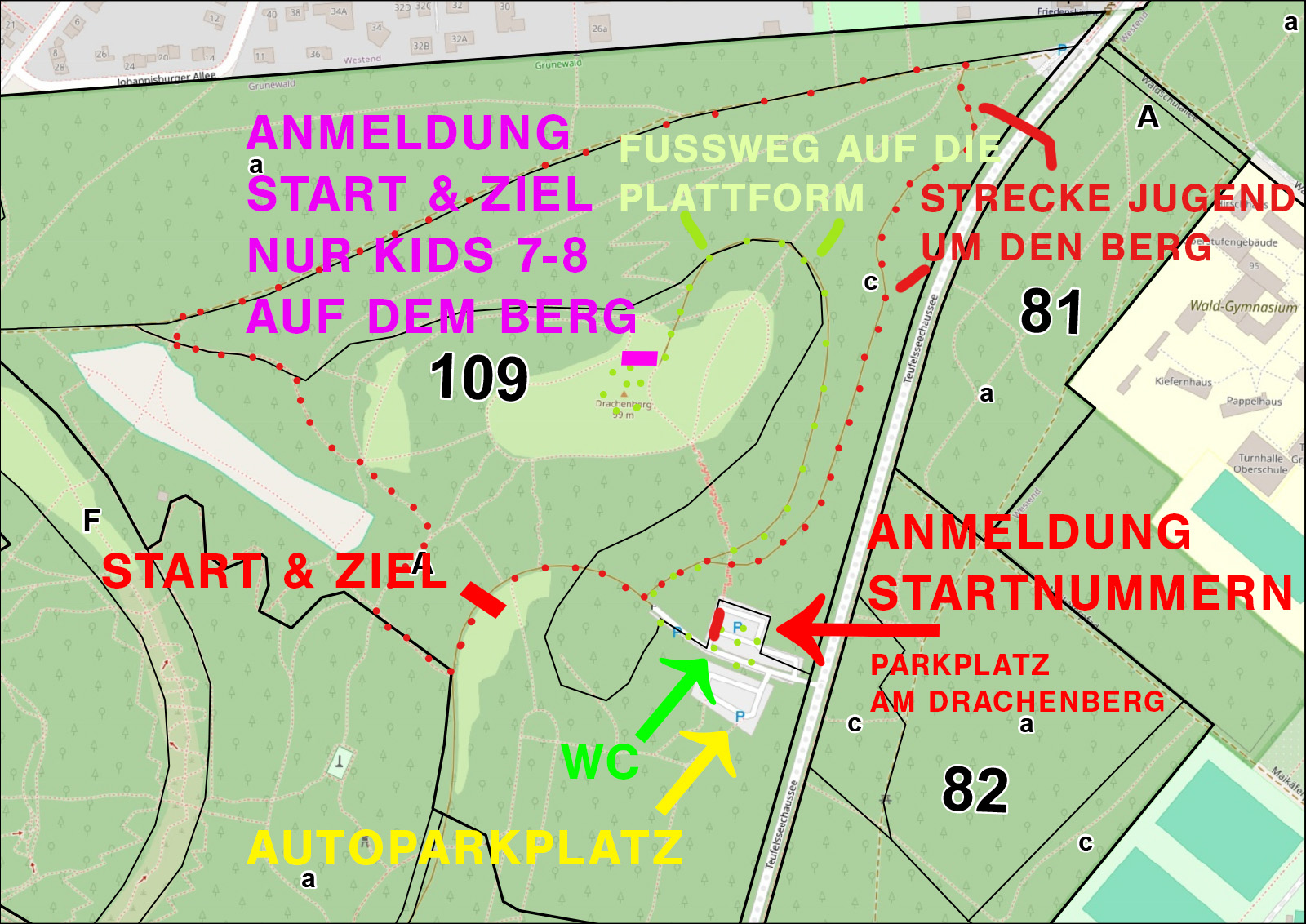 Die Strecke wird um und auf dem Drachenberg in der Umgebung des Berliner Teufelsbergs geplant. Dies sind die geplanten Strecken: